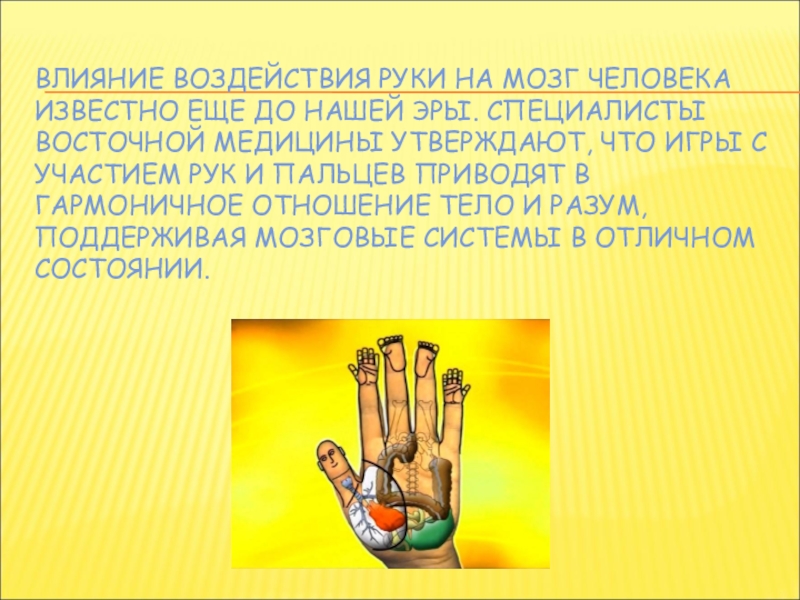 Слайд 12ВЛИЯНИЕ ВОЗДЕЙСТВИЯ РУКИ НА МОЗГ ЧЕЛОВЕКА ИЗВЕСТНО ЕЩЕ ДО НАШЕЙ ЭРЫ.