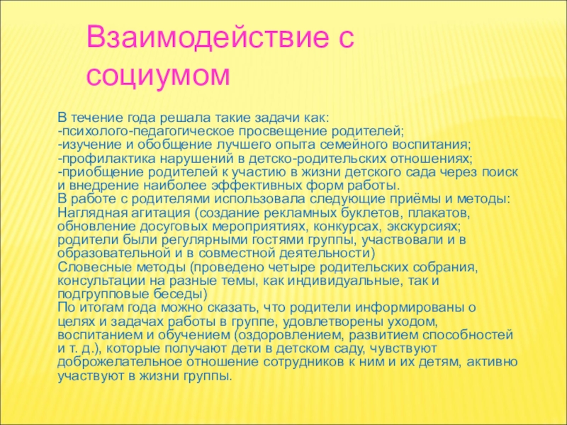 По итогам года можно сказать, что родители информированы о целях и задачах работы в группе, удовлетворены уходом, воспитанием и обучением (оздоровлением, развитием способностей и т. д.), которые получают дети в детском саду, чувствуют доброжелательное отношение сотрудников к ним и их детям, активно участвуют в жизни группы.