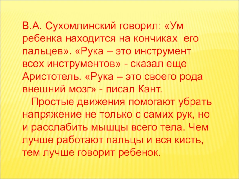 Слайд 10В.А. Сухомлинский говорил: «Ум ребенка находится на кончиках его пальцев». «Рука