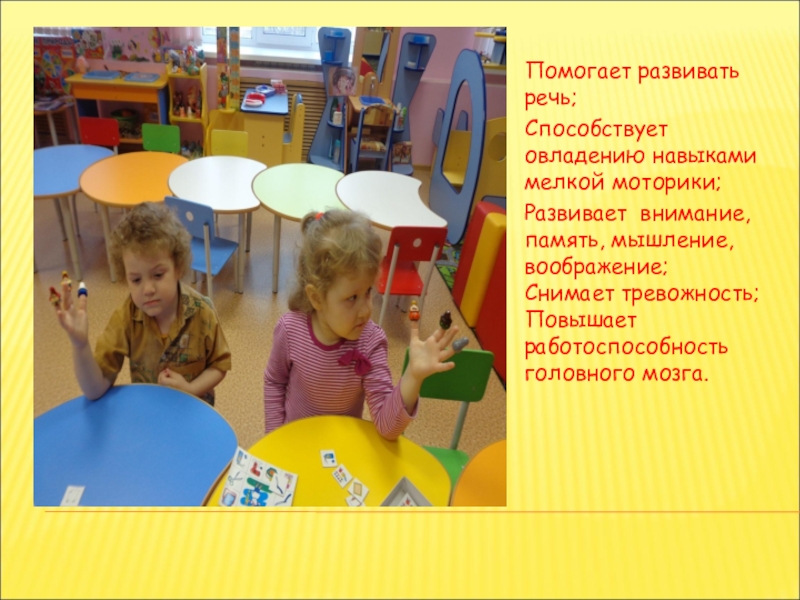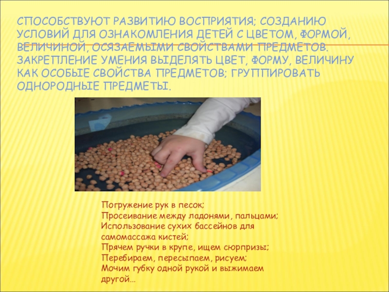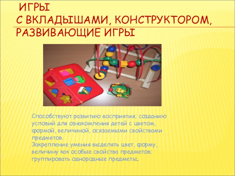 Слайд 19СПОСОБСТВУЮТ РАЗВИТИЮ ВОСПРИЯТИЯ; СОЗДАНИЮ УСЛОВИЙ ДЛЯ ОЗНАКОМЛЕНИЯ ДЕТЕЙ С ЦВЕТОМ, ФОРМОЙ,