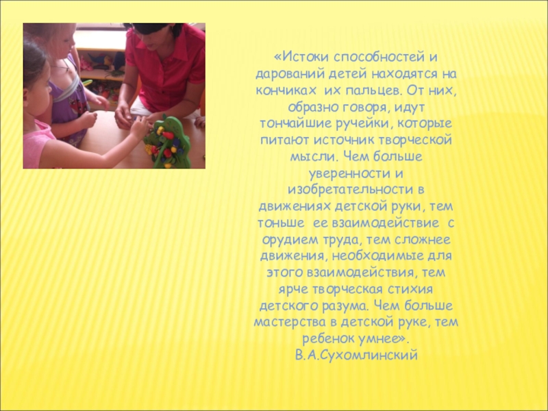 Слайд 11«Истоки способностей и дарований детей находятся на кончиках их пальцев. От