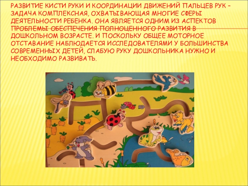 Слайд 28РАЗВИТИЕ КИСТИ РУКИ И КООРДИНАЦИИ ДВИЖЕНИЙ ПАЛЬЦЕВ РУК – ЗАДАЧА КОМПЛЕКСНАЯ,