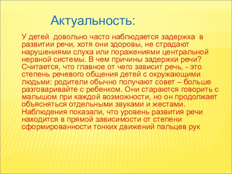 Наблюдения показали, что уровень развития речи находится в прямой зависимости от степени сформированности тонких движений пальцев рук