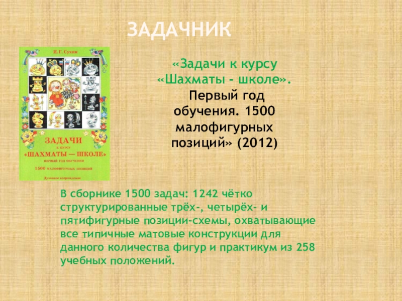 В сборнике 1500 задач: 1242 чётко структурированные трёх-, четырёх- и пятифигурные позиции-схемы, охватывающие все типичные матовые конструкции для данного количества фигур и практикум из 258 учебных положений.
