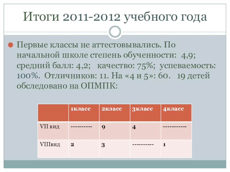 обученности: 4,9; средний балл: 4,2; качество: 75%; успеваемость: 100%. Отличников: 11. На «4 и 5»: 60. 19 детей обследовано на ОПМПК: