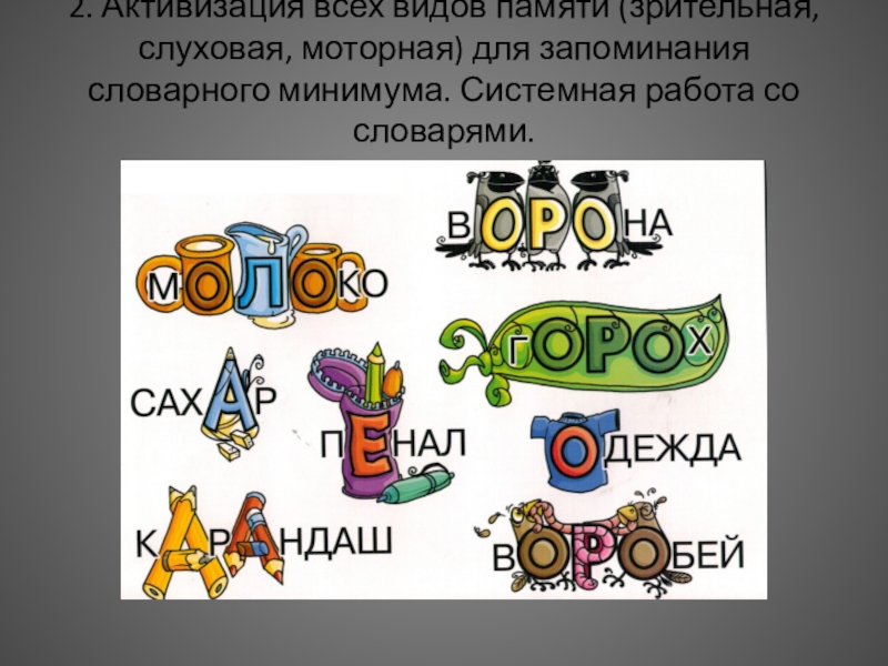 2. Активизация всех видов памяти (зрительная, слуховая, моторная) для запоминания словарного