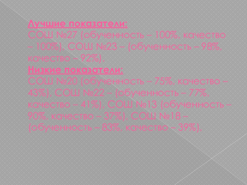 СОШ №20 (обученность – 75%, качество – 43%), СОШ №22 – (обученность – 77%, качество – 41%), СОШ №13 (обученность – 90%, качество – 37%), СОШ №18 – (обученность – 83%, качество – 39%),