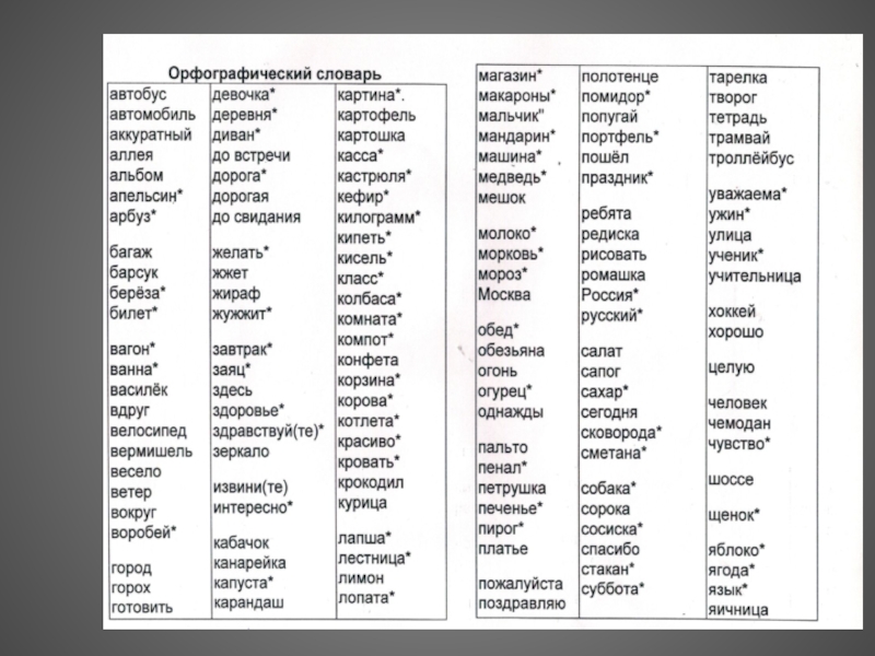 правописание словарных слов;