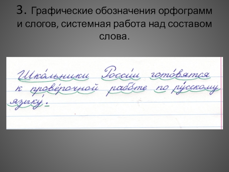 Слайд 133. Графические обозначения орфограмм и слогов, системная работа над составом слова.