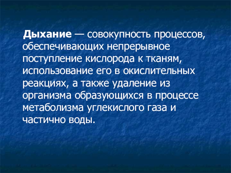 Дыхание — совокупность процессов, обеспечивающих непрерывное поступление кислорода к тканям, использование его в окислительных реакциях,