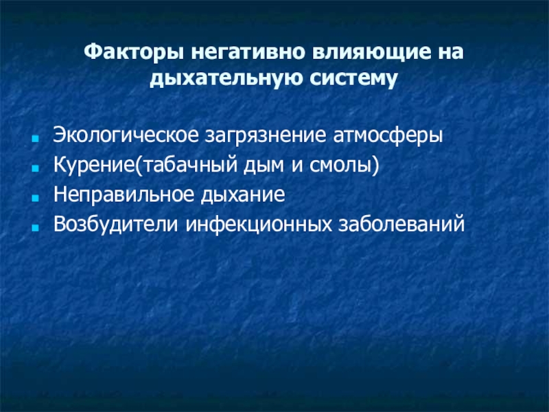 Факторы негативно влияющие на дыхательную системуЭкологическое загрязнение атмосферыКурение(табачный дым и смолы)Неправильное дыханиеВозбудители инфекционных заболеваний