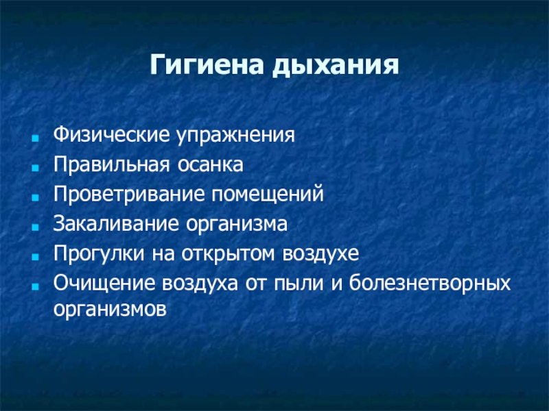 Гигиена дыханияФизические упражненияПравильная осанкаПроветривание помещенийЗакаливание организмаПрогулки на открытом воздухеОчищение воздуха от пыли и болезнетворных организмов