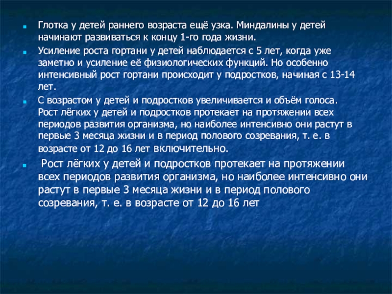 Усиление роста гортани у детей наблюдается с 5 лет, когда уже заметно и усиление её физиологических функций. Но особенно интенсивный рост гортани происходит у подростков, начиная с 13-14 лет.