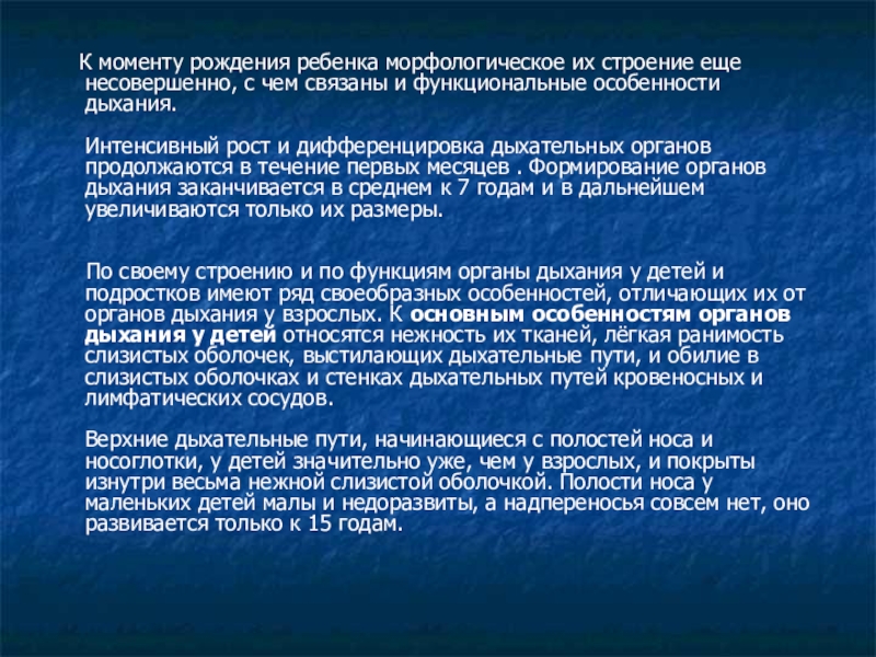 морфологическое их строение еще несовершенно, с чем связаны и функциональные особенности дыхания.  Интенсивный рост и дифференцировка дыхательных органов продолжаются в течение первых месяцев . Формирование органов дыхания заканчивается в среднем к 7 годам и в дальнейшем увеличиваются только их размеры.