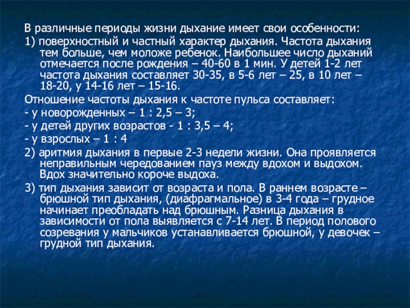 В различные периоды жизни дыхание имеет свои особенности:1) поверхностный и частный характер дыхания. Частота дыхания тем больше,