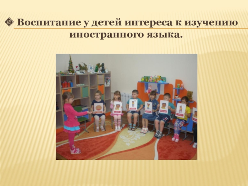 Слайд 6 Воспитание у детей интереса к изучению иностранного языка.