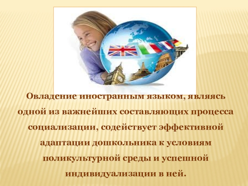 Слайд 3Овладение иностранным языком, являясь одной из важнейших составляющих процесса социализации, содействует