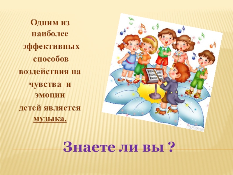 Знаете ли вы ?Одним из наиболее эффективных способов воздействия на чувства и эмоции детей является музыка.