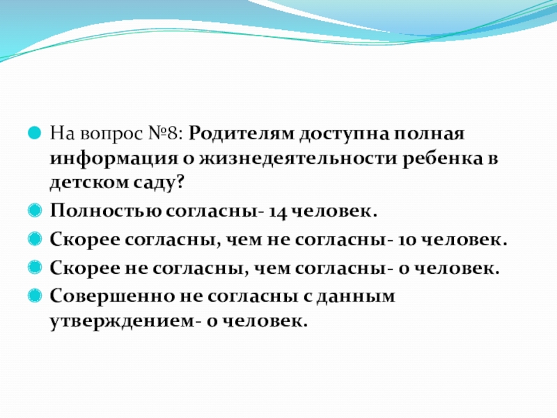 Слайд 17На вопрос №8: Родителям доступна полная информация о жизнедеятельности ребенка в