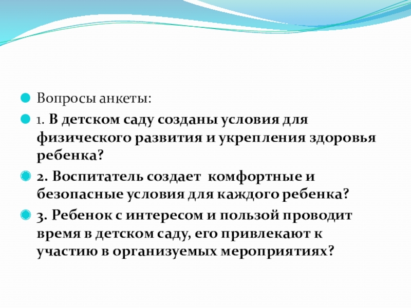 вопросов. Родителям, принимавшим участие в анкетировании, предлагалось внимательно прочесть перечисленные ниже утверждения и выразить свое мнение о квалифицированности педагогов, о развитии ребенка в ДОУ и взаимодействие педагогов и родителей.