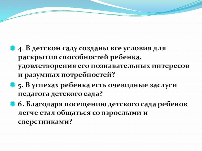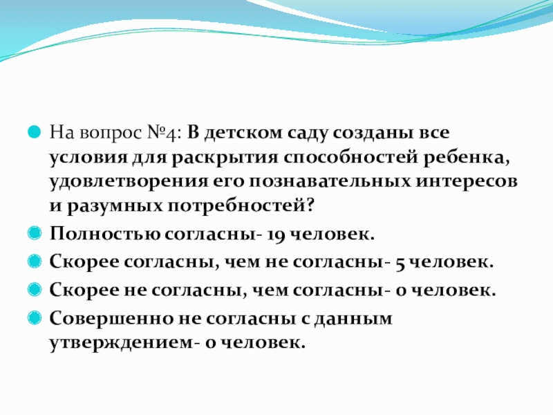 Слайд 13На вопрос №4: В детском саду созданы все условия для раскрытия