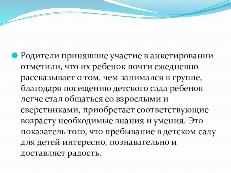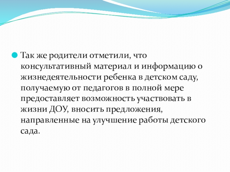 Слайд 22Так же родители отметили, что консультативный материал и информацию о жизнедеятельности