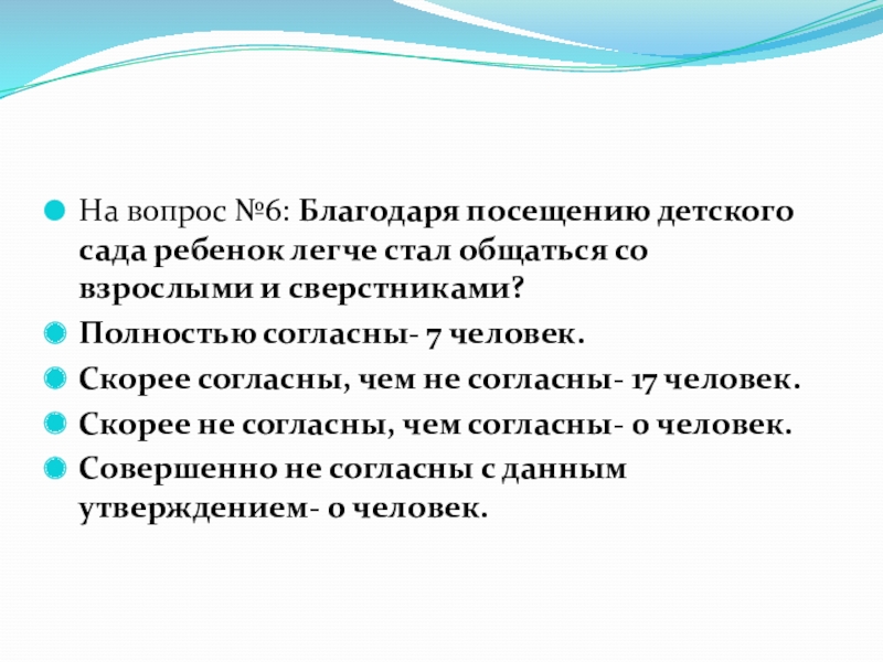 Слайд 15На вопрос №6: Благодаря посещению детского сада ребенок легче стал общаться