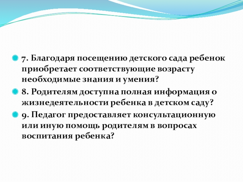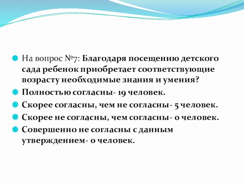 Слайд 16На вопрос №7: Благодаря посещению детского сада ребенок приобретает соответствующие возрасту