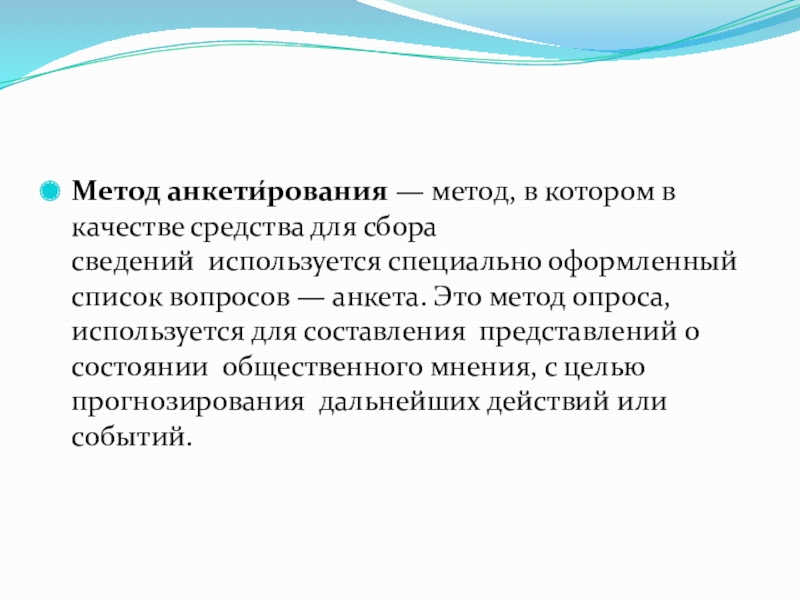 Слайд 2Метод анкети́рования — метод, в котором в качестве средства для сбора сведений используется
