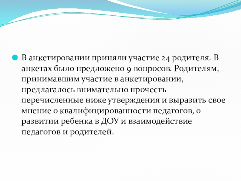 Слайд 5В анкетировании приняли участие 24 родителя. В анкетах было предложено 9