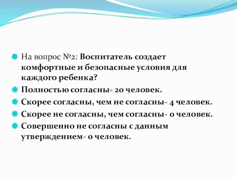 Слайд 11На вопрос №2: Воспитатель создает комфортные и безопасные условия для каждого