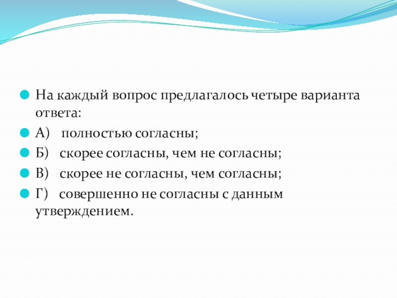 Слайд 9На каждый вопрос предлагалось четыре варианта ответа: