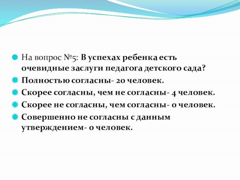 Слайд 14На вопрос №5: В успехах ребенка есть очевидные заслуги педагога детского