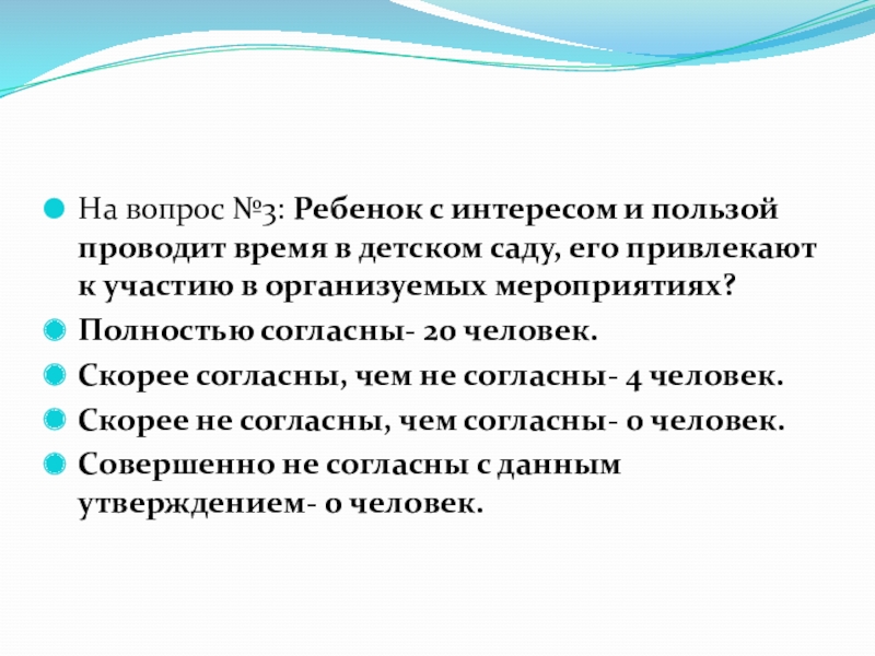 Слайд 12На вопрос №3: Ребенок с интересом и пользой проводит время в