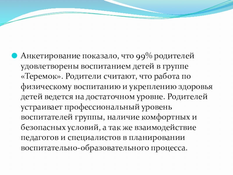 Слайд 20Анкетирование показало, что 99% родителей удовлетворены воспитанием детей в группе «Теремок».
