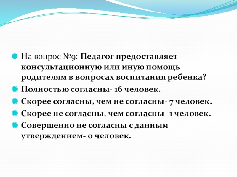 Слайд 18На вопрос №9: Педагог предоставляет консультационную или иную помощь родителям в