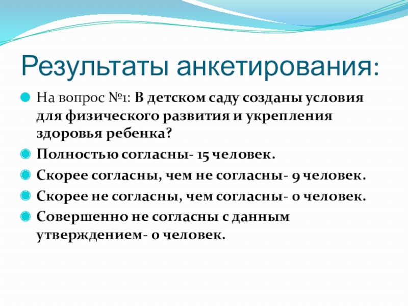 Родители считают, что работа по физическому воспитанию и укреплению здоровья детей ведется на достаточном уровне. Родителей устраивает профессиональный уровень воспитателей группы, наличие комфортных и безопасных условий, а так же взаимодействие педагогов и специалистов в планировании воспитательно-образовательного процесса.