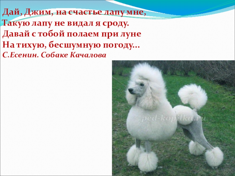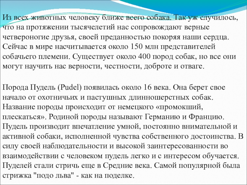 Порода Пудель (Pudel) появилась около 16 века. Она берет свое начало от охотничьих и пастушных длинношерстных собак. Название породы происходит от немецкого «промокший, плескаться». Родиной породы называют Германию и Францию. Пудель производит впечатление умной, постоянно внимательной и активной собаки, исполненной чувства собственного достоинства. В силу своей наблюдательности и высокой заинтересованности во взаимодействии с человеком пудель легко и с интересом обучается.