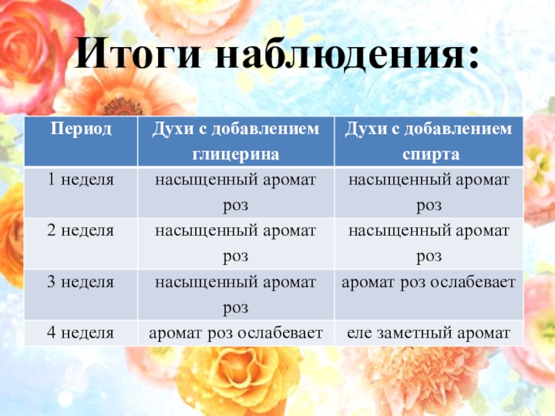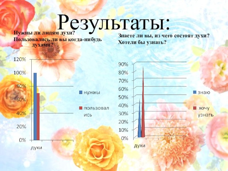 Результаты:Нужны ли людям духи?Пользовались ли вы когда-нибудь духами?Знаете ли вы, из чего состоят духи? Хотели бы узнать?
