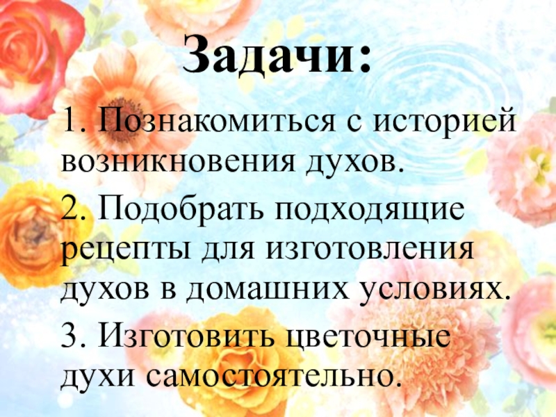 Задачи:1. Познакомиться с историей возникновения духов.2. Подобрать подходящие рецепты для изготовления духов в домашних условиях.3. Изготовить цветочные
