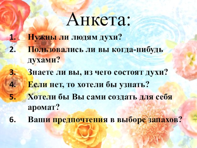 Анкета:Нужны ли людям духи?Пользовались ли вы когда-нибудь духами?Знаете ли вы, из чего состоят духи? Если нет, то