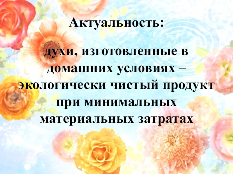 Актуальность:духи, изготовленные в домашних условиях – экологически чистый продукт при минимальных материальных затратах