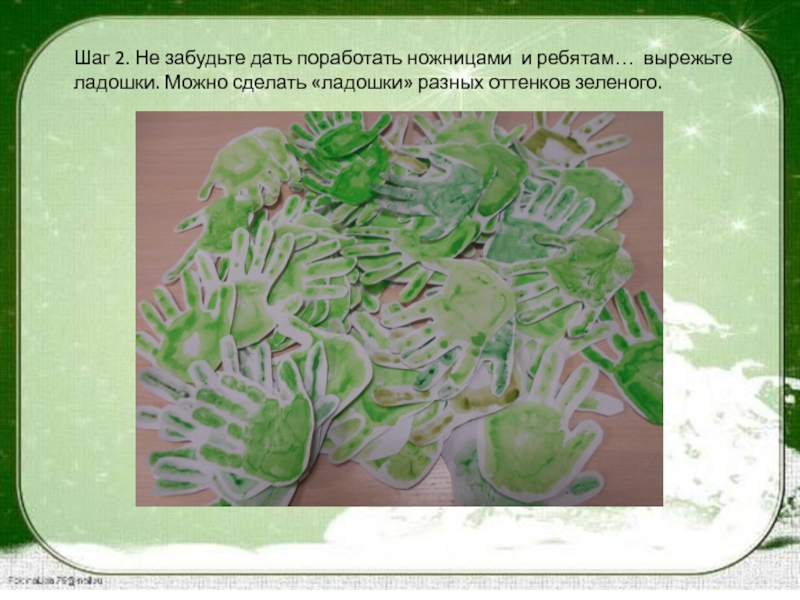Шаг 2. Не забудьте дать поработать ножницами и ребятам… вырежьте ладошки. Можно сделать «ладошки» разных оттенков зеленого.