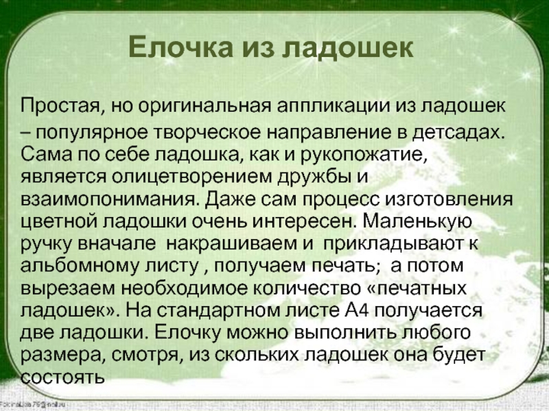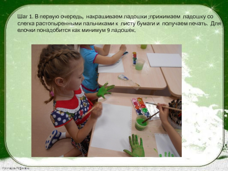 Шаг 1. В первую очередь, накрашиваем ладошки ;прижимаем ладошку со слегка растопыренными пальчиками к листу бумаги и получаем печать. Для елочки понадобится как минимум 9 ладошек.