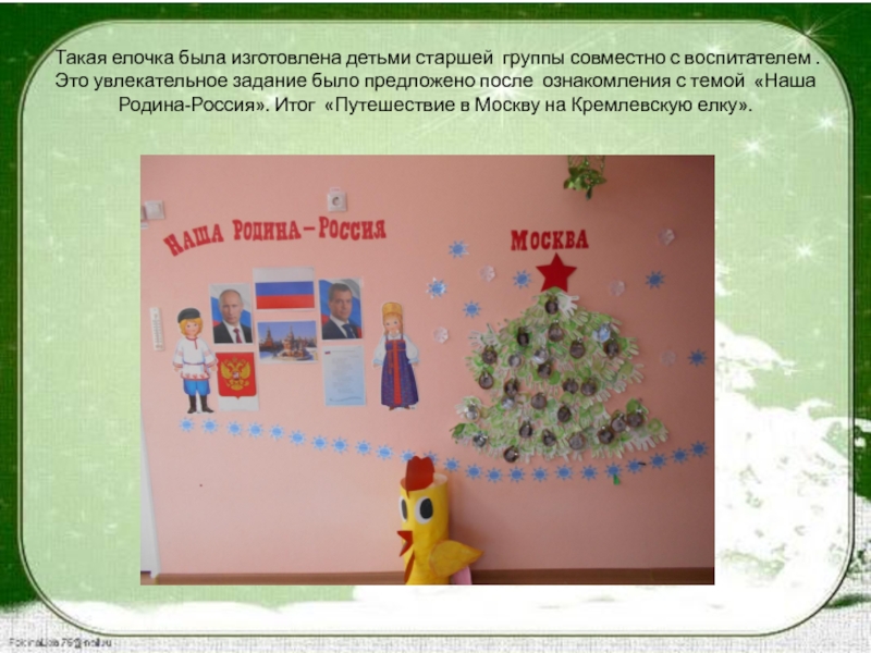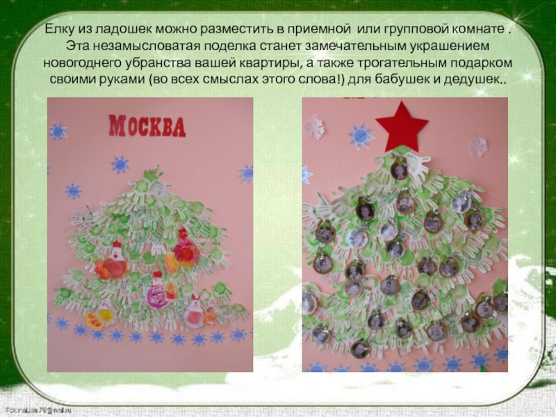 Шаг 5. Далее формируем елку… берем готовые ладошки, склеиваем скотчем и прикрепляем к стене в форме ЕЛЕ. Ребята прикрепляют шары со своим фото на готовую ЕЛЬ. Остается взлохматить веточки новогодней красавицы, сильно подув на нее снизу вверх.