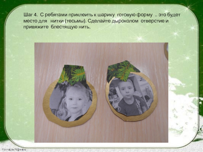 Шаг 4. С ребятами приклеить к шарику готовую форму .. это будет место для нитки (тесьмы). Сделайте дыроколом отверстие и привяжите блестящую нить.