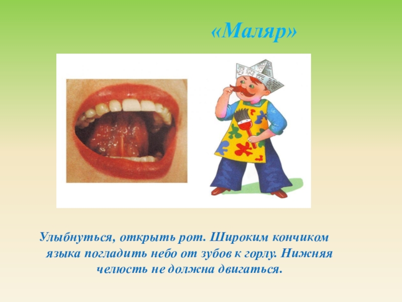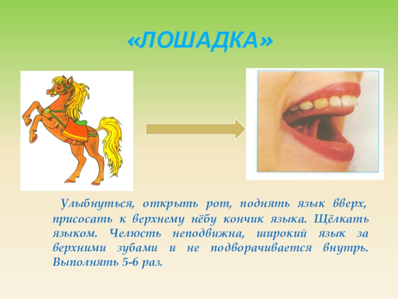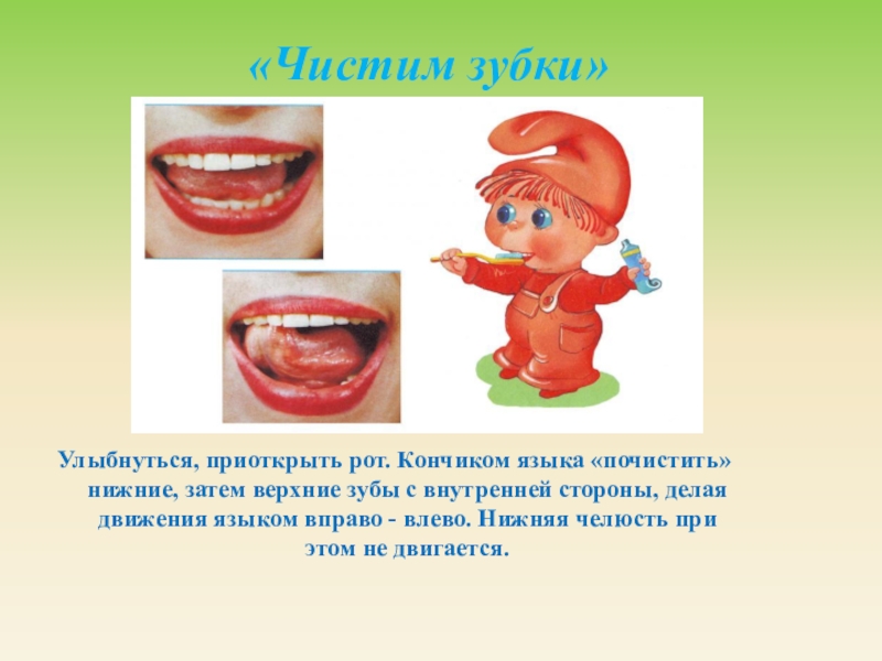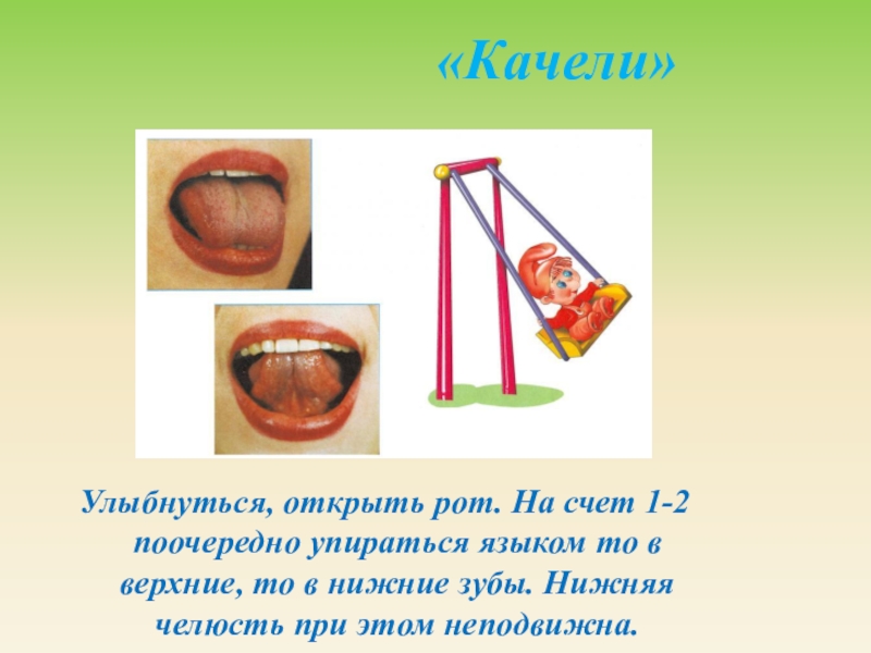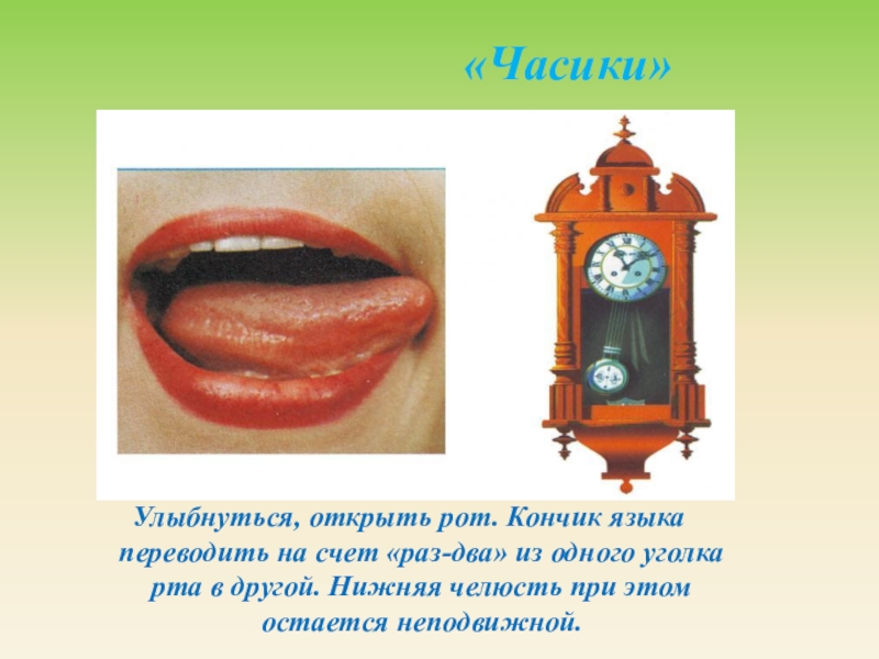Улыбнуться, открыть рот. Кончик языка переводить на счет «раз-два» из одного уголка рта в другой. Нижняя челюсть при этом остается неподвижной.