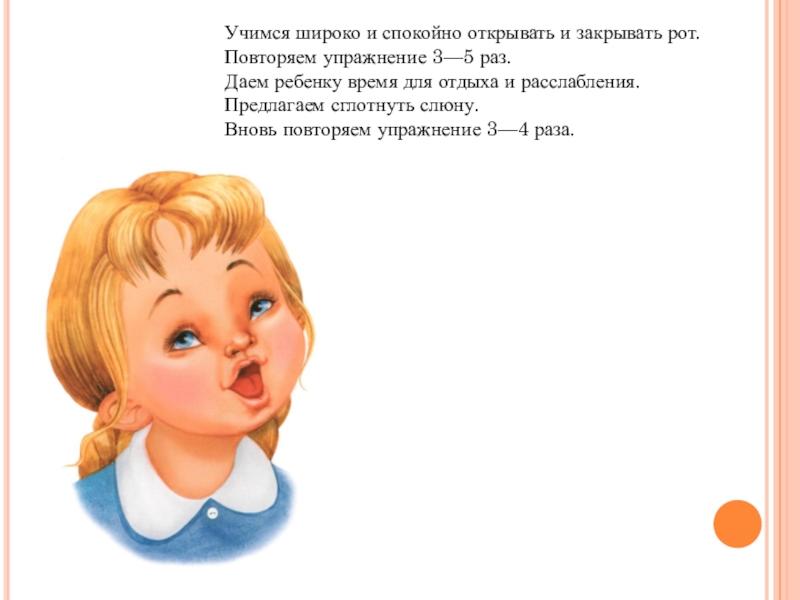 Слайд 4Учимся широко и спокойно открывать и закрывать рот.