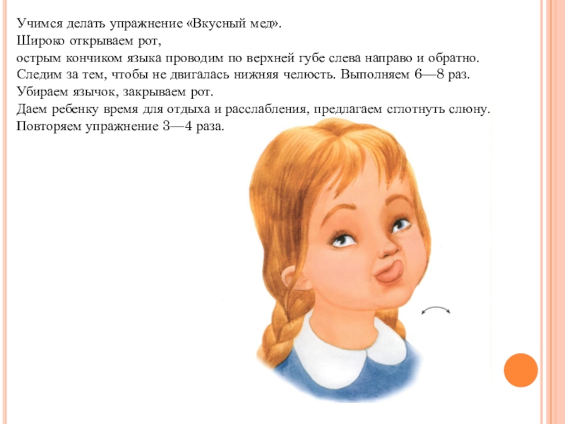Слайд 24Учимся делать упражнение «Вкусный мед».