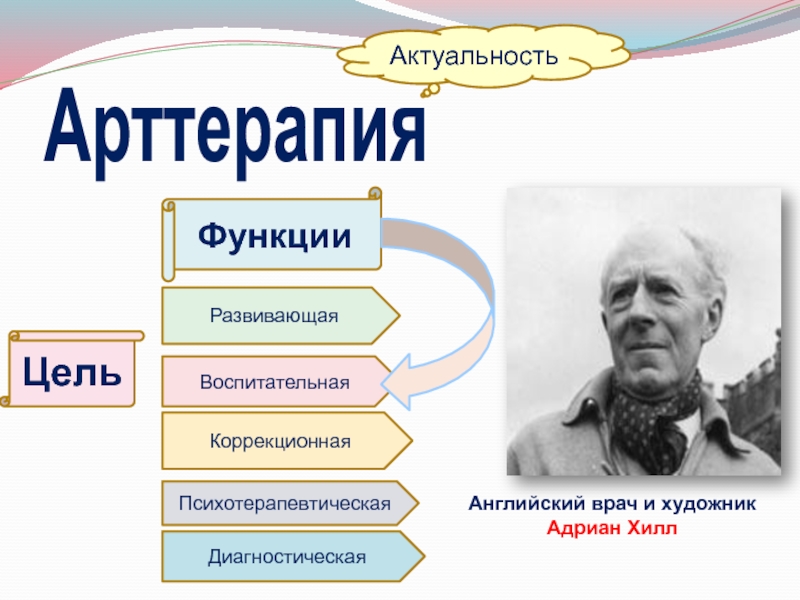 Английский врач и художник Адриан ХиллАрттерапияАктуальностьЦельФункцииКоррекционнаяРазвивающаяПсихотерапевтическаяДиагностическаяВоспитательная